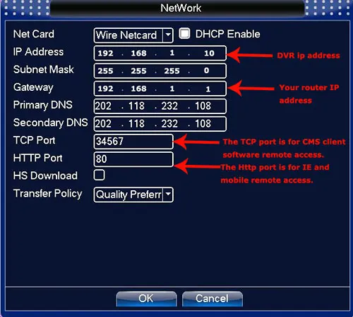 3. آدرس IP دستگاه را از این قسمت تنظیم کنید. این آدرس باید رنجی برابر رنج شبکه اصلی شما داشته باشد و قسمت آخر آدرس نباید مشابه هیچ یک از تجهیزات موجود در شبکه باشد. (در تصویر زیر نمونه‌ای از منوی شبکه یک DVR را می‌بینید. قسمت IP Address قسمتی است که باید تنظیم شود).