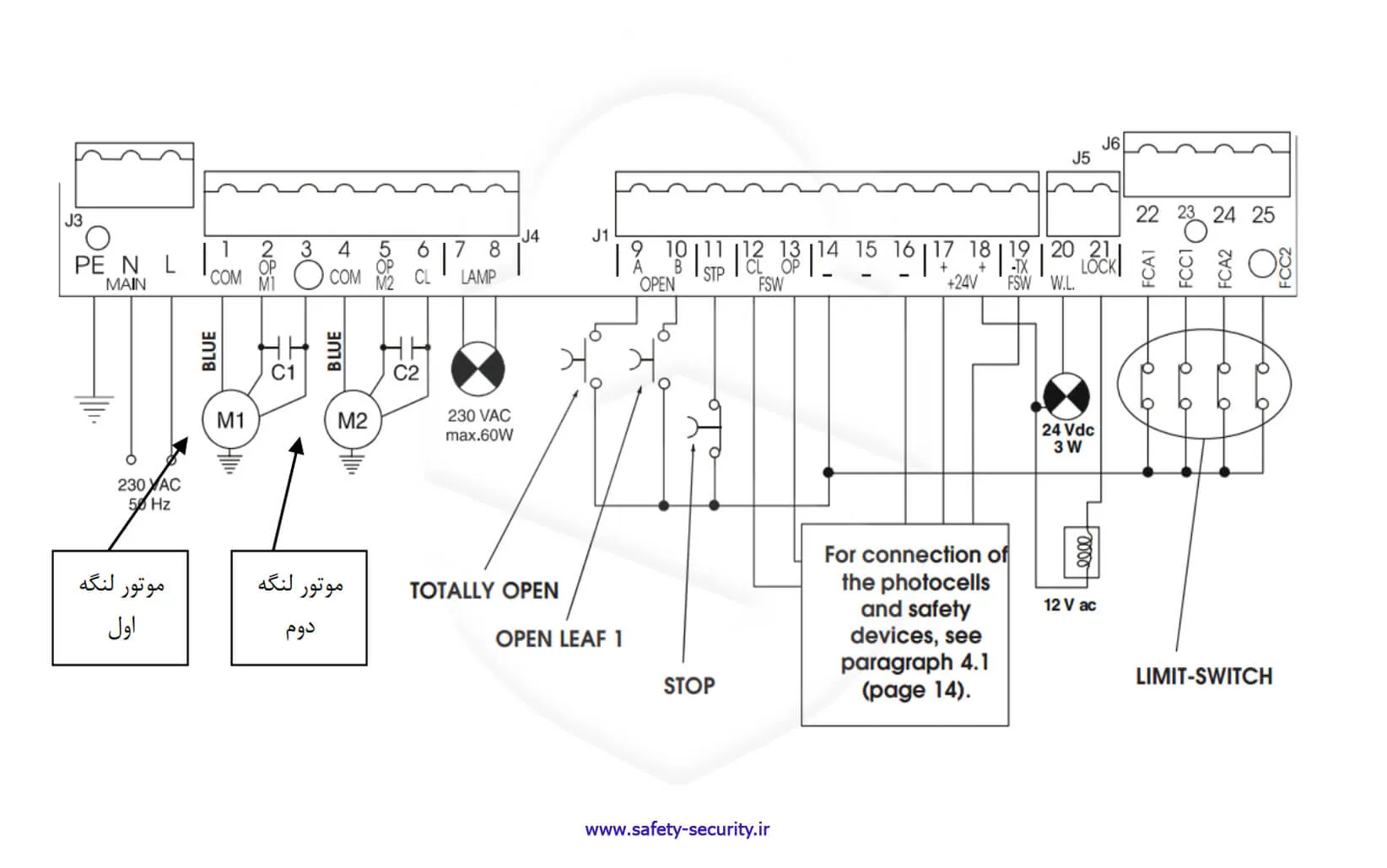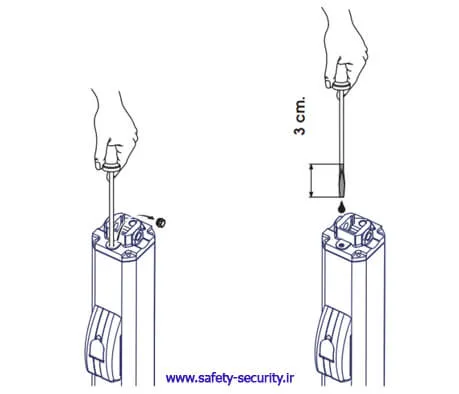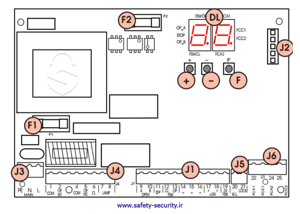 • سیم‌های موتور درب اول (دری که اول باز می‌شود) به 1 و 2 و ۳ وصل شود و موتور درب زیر (دوم) به 4 و ۵ و 6 وصل شود.