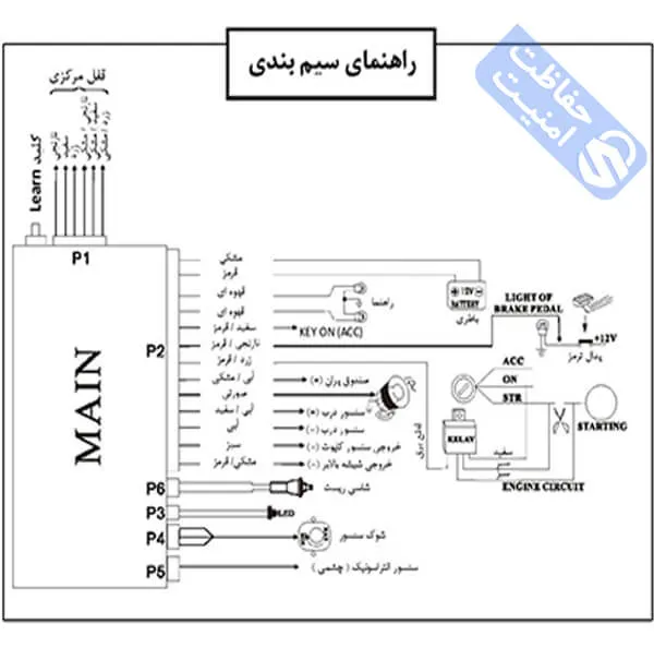 در نقشه سیمبندی دزدگیر PLC این کانکتور دارای 6 ورودی به شرح زیر میباشد، همچنین در دیاگرام زیر (روشهای بستن قفل مرکزی به سیمهای خروجی پمپ دستگاه) به طور کامل روشهای بستن قفل مرکزی به سیمهای خروجی پمپ دستگاه شرح داده شده است: