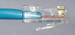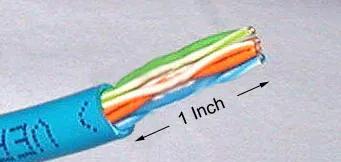 1- ابتدا کابل شبکه را به اندازه حدود 2.5 سانتیمتر (یک اینچ) مانند شکل لخت کنید. برای لخت کردن کابل میتوانید از سیم لخت کن یا کاتر استفاده کنید.