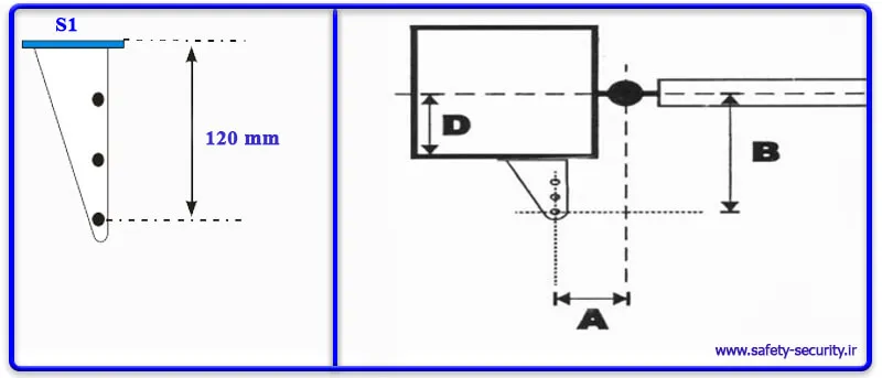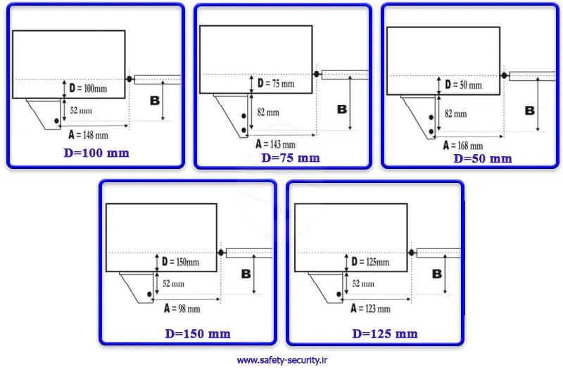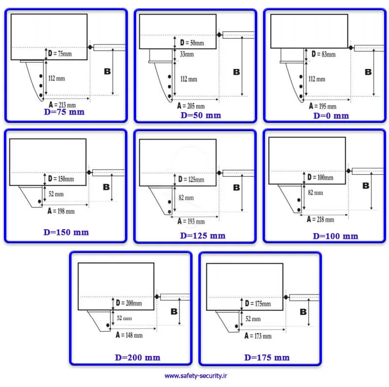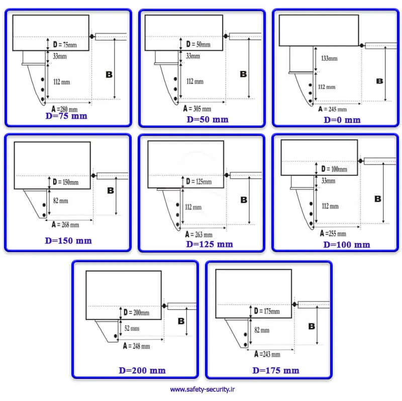 - D: فاصله عمودی مرکز لولای درب تا کف پایه نگه دارنده ابتدای بازو