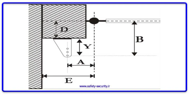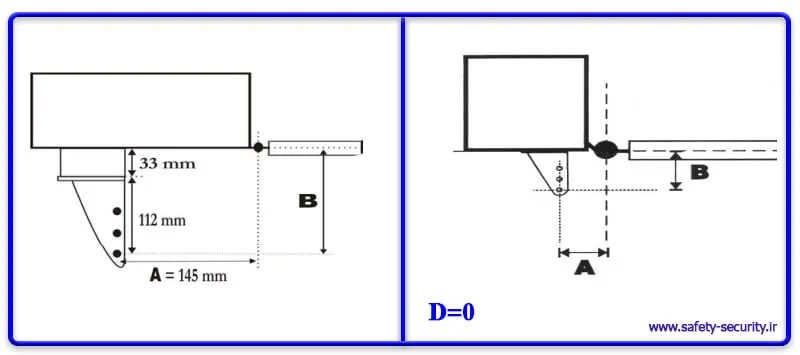 - B: فاصله عمودی بین مرکز لولای درب تا مرکز جای چرخش ابتدای بازو روی تکیهگاه