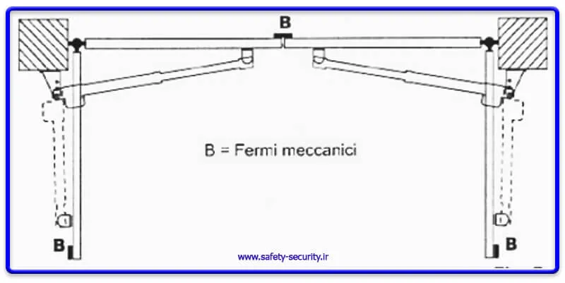 نکته: فاصله E برای گیر نکردن متعلقات به دیوار باید بزرگتر از A+100 mm باشد. - مطابق قسمت شکل زیر STOPهایی از یک وسیله محکم جهت ثابت نگه داشتن، در ابتدا و انتهای زاویه چرخش درب بر روی زمین یا چارچوب باید تعبیه شود. چنانچه مدت زمان باز و بسته شدن درب به هر دلیلی تغییر نماید، STOPها مانع از وارد آمدن فشار مـضاعف بـه درب و یا جک میشود.