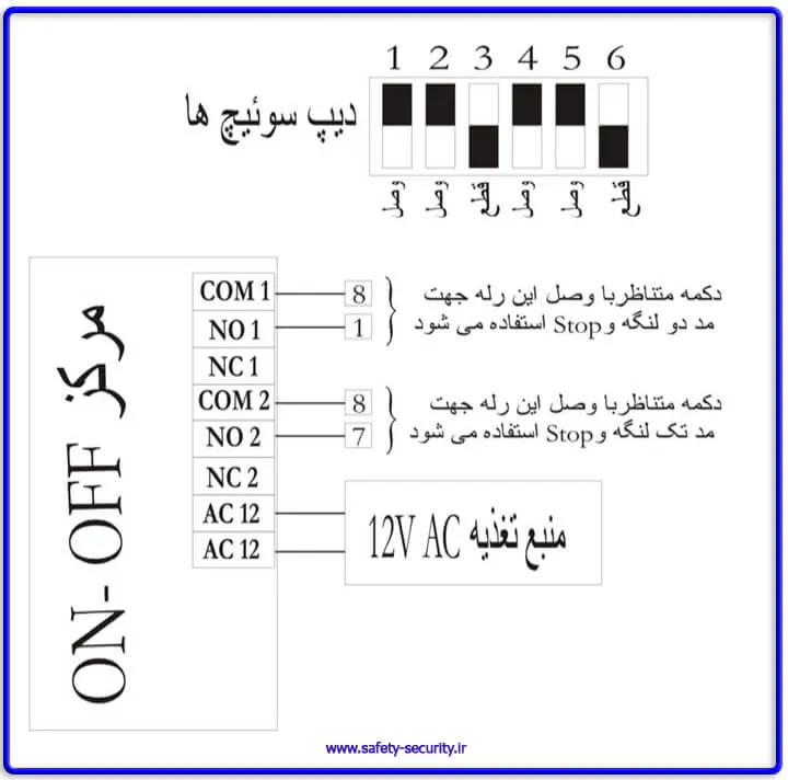 نکته: چنانچه در صورت درست بودن سیمکشیها و نحوه قرار گرفتن دیپ سوئیچها، باز هم اختلاف عملکردی بین ریموت ON–OFF با ریموت فابریک مشاهده نمودید، میتوانید دیپ سوئیچهای 1 و 4 را برای ایجاد پالس کوتاه در حالت قطع قرار دهید. نحوه عملکرد مدهای ON-OFF به تفصیل در دفترچه راهنمای آن توضیح داده شده است.